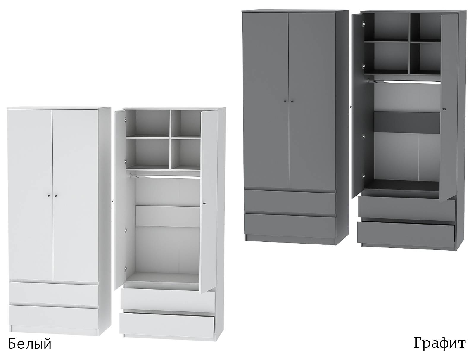 Функциональный, практичный двухдверный шкаф отлично впишется в интерьер любой комнаты. Он вместит в себя достаточное количество вещей благодаря наличию полок, металлической штанги и двух выдвижных ящиков.