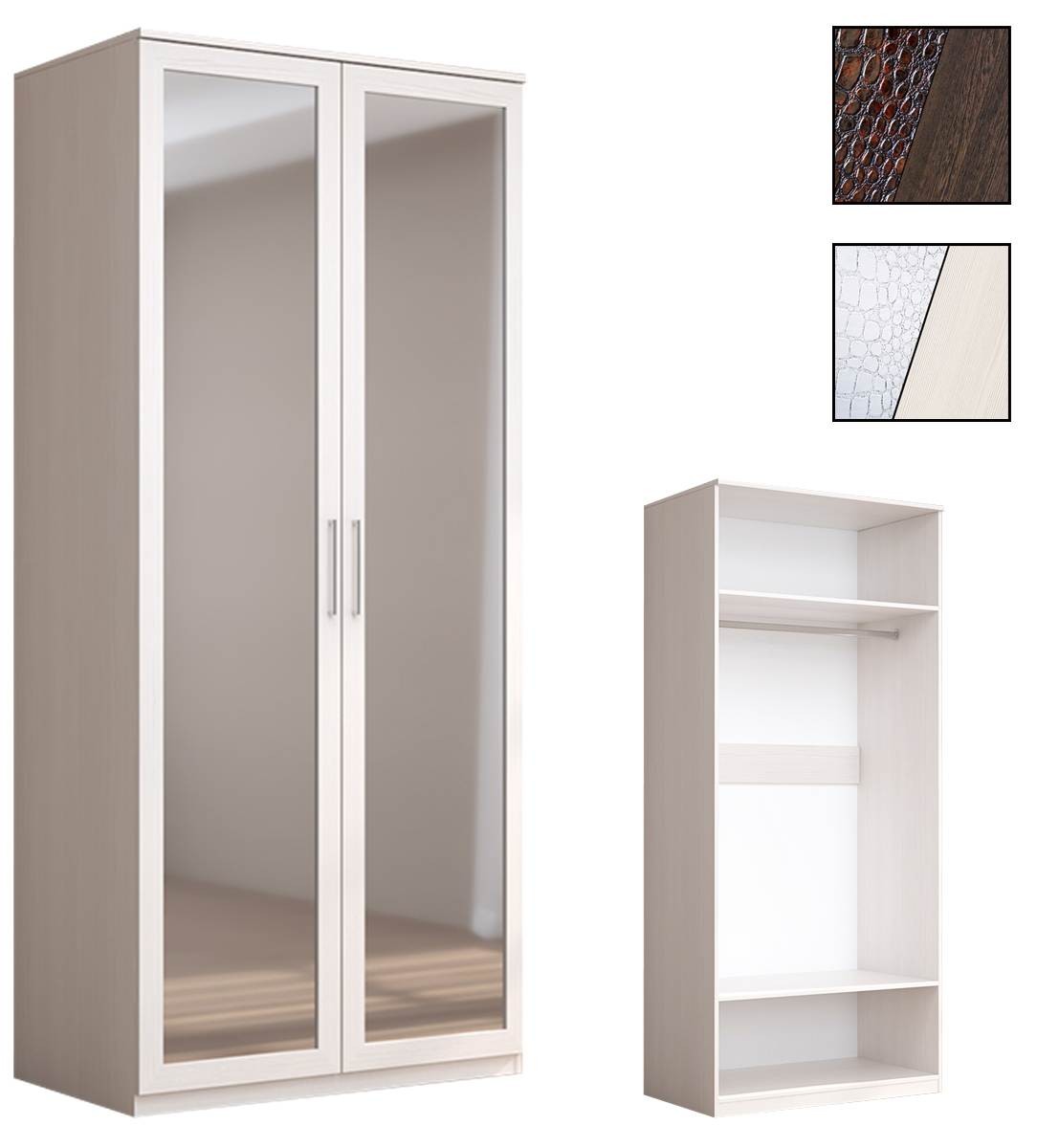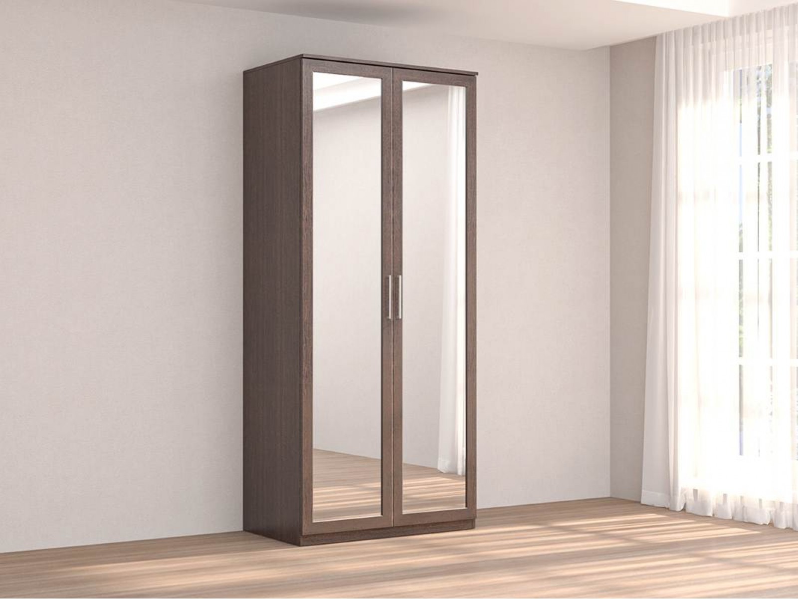 Двухстворчатый шкаф с зеркалом идеально сочетает в себе классическую добротность и современный дизайн. Он практичный, долговечный, прост в эксплуатации. Большие зеркала на фасаде создают ощущение воздушности, глубины и простора, позволяют оценить владельцу свой внешний вид с головы до ног.