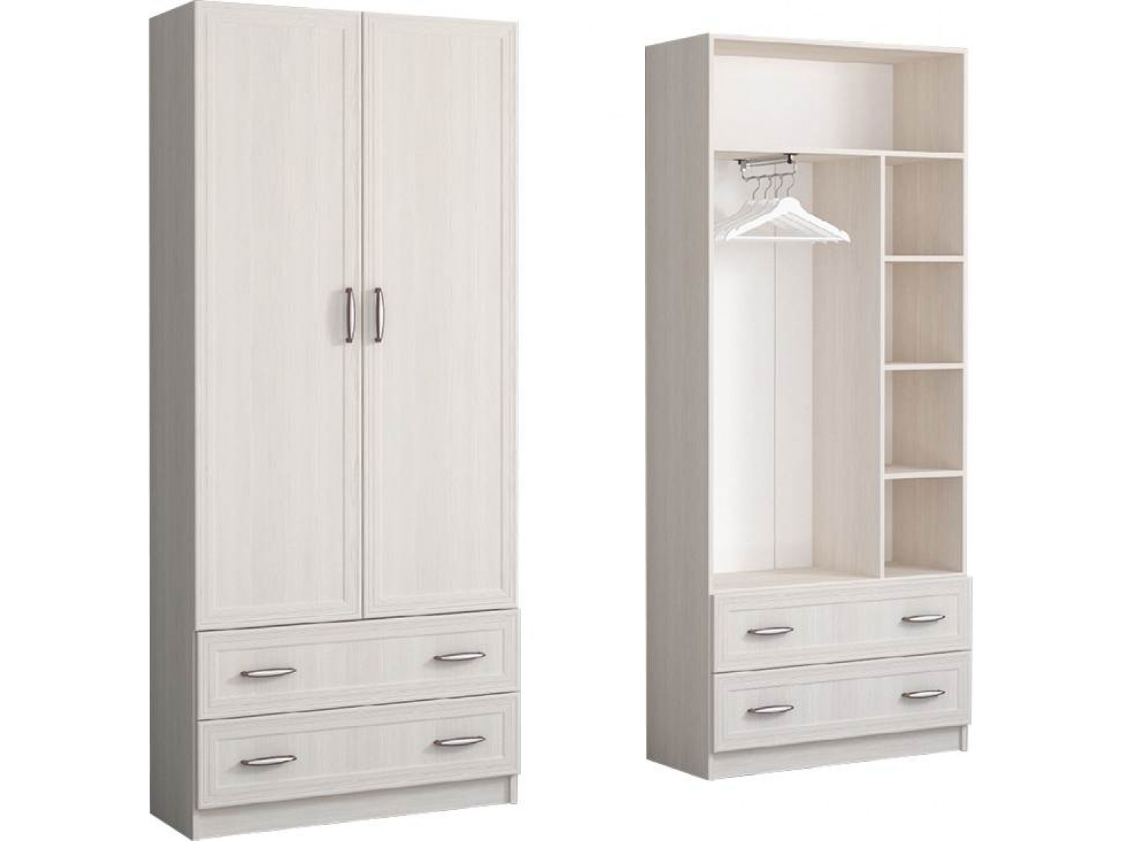 Вместительный двухстворчатый шкаф - это классика, проверенная временем. Он удобен, надёжен и функционален для любого пользователя. За распашными дверями находятся: антресольная полка, ниша с тремя полками для белья, выкатная штанга для одежды; внизу - два больших выдвижных ящика.