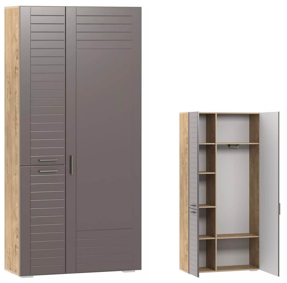 Шкаф имеет две секции и три глухих распашных двери, за которыми расположены семь полок для хранения и телескопическая штанга для плечиков с одеждой.