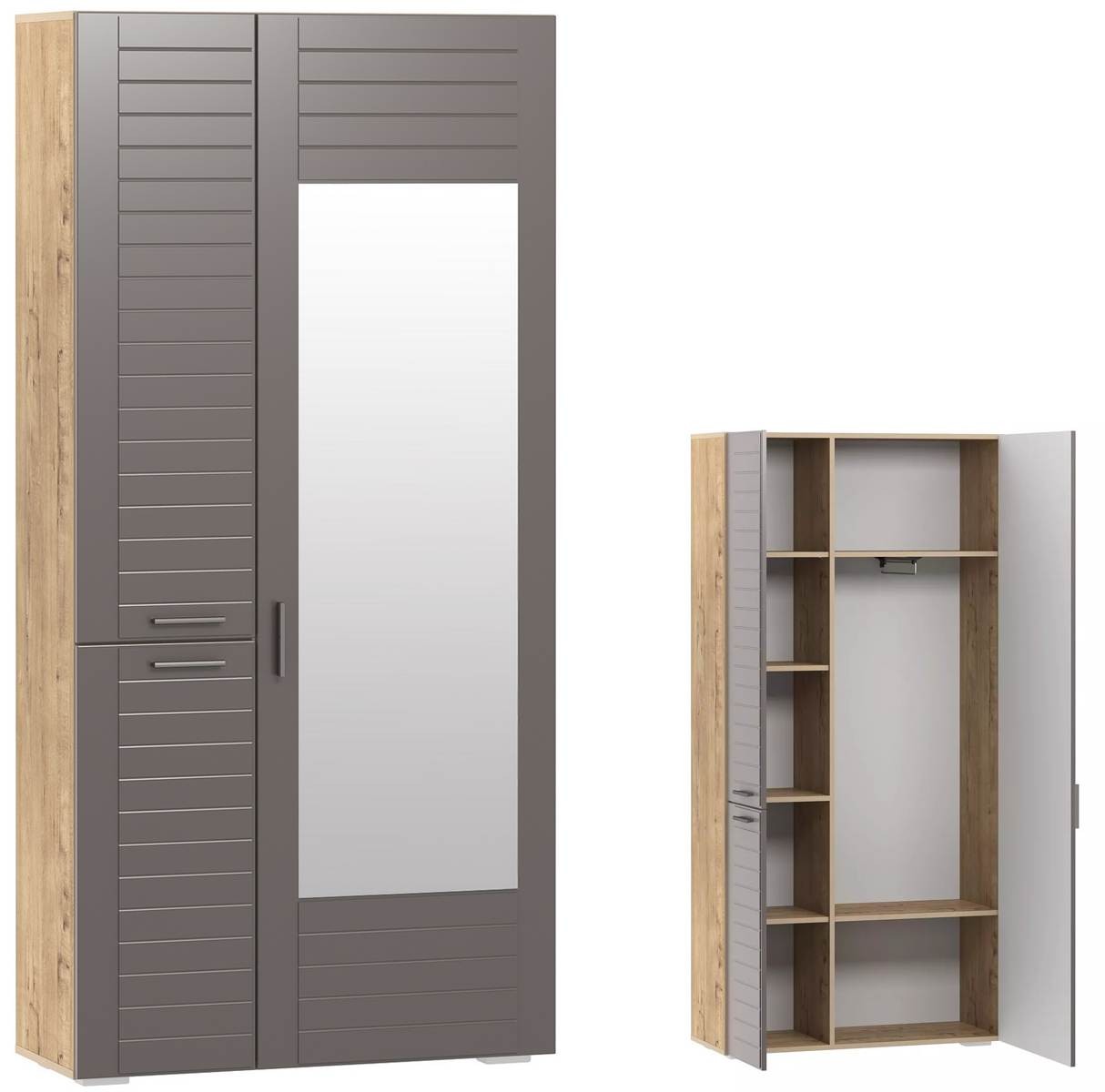Шкаф имеет две секции и две глухих и одну зеркальную распашные двери, за которыми расположены семь полок для хранения и телескопическая штанга для плечиков с одеждой.