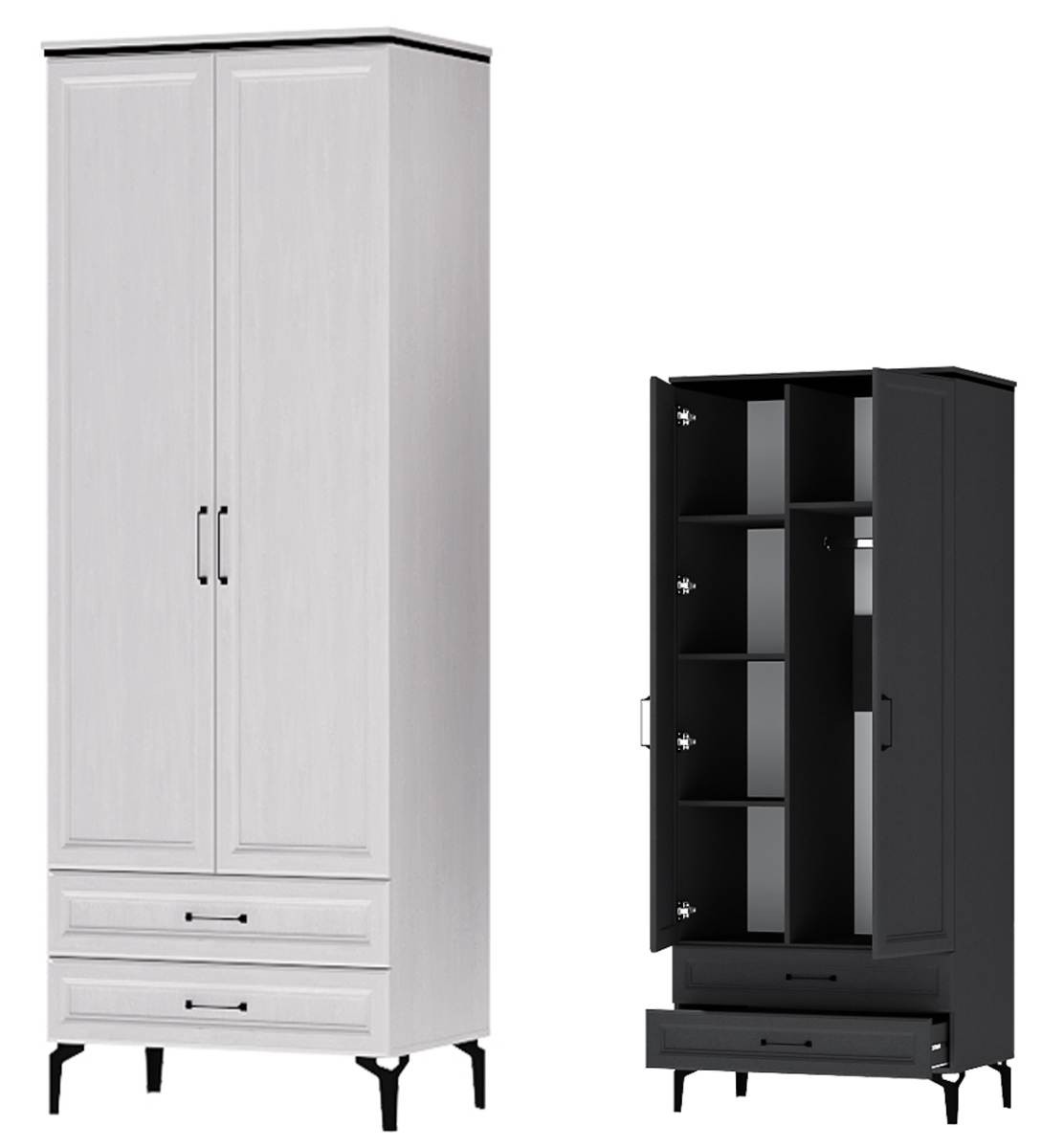 Функциональный, практичный двухдверный шкаф отлично впишется в интерьер любой комнаты. Он вместит в себя достаточное количество вещей благодаря наличию полок, металлической штанги и двух выдвижных ящиков.