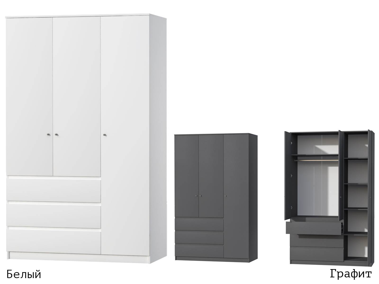 Функциональный, практичный трёхдверный шкаф отлично впишется в интерьер любой комнаты. Он вместит в себя достаточное количество вещей благодаря наличию полок, металлической штанги и трёх выдвижных ящиков.