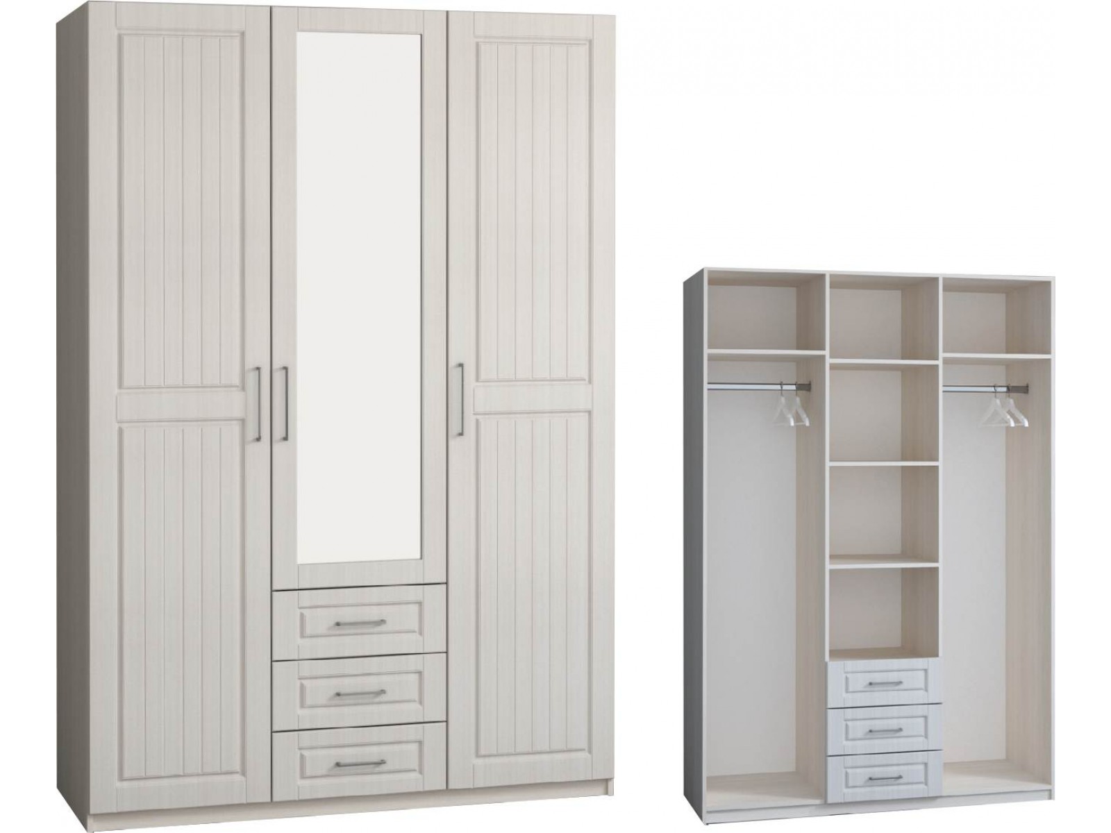 Внутреннее наполнение: две крайние секции со штангой для одежды и полкой, средняя секция с тремя полками и тремя ящиками.