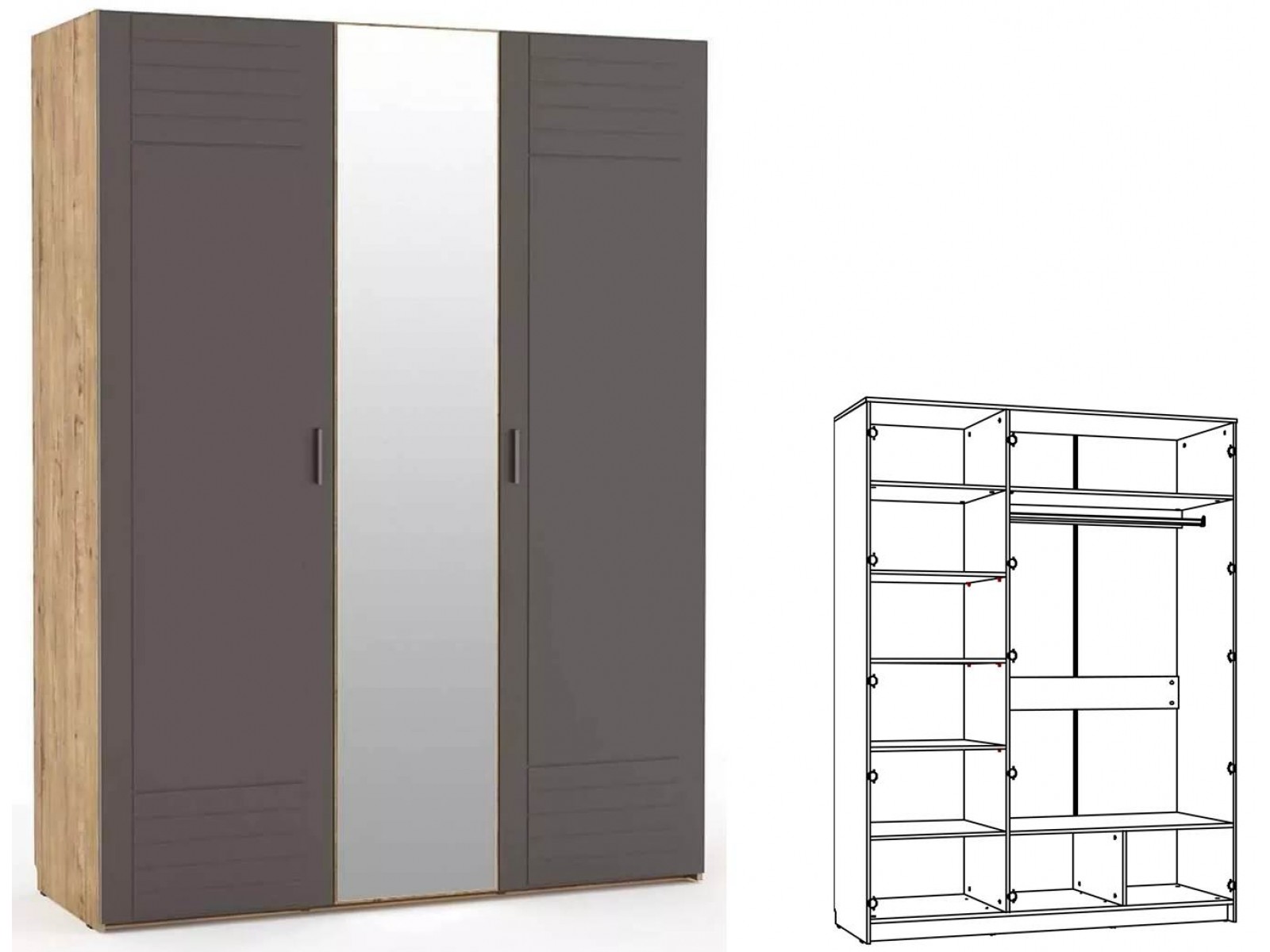 Шкаф имеет две секции, закрывающиеся тремя распашными дверцами.