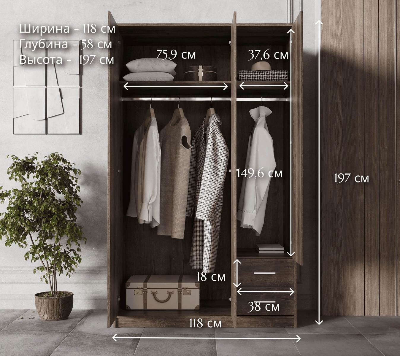 Трёхстворчатый распашной шкаф Nepo SZF3D2S поставляется и с полками, и со штангой - можно использовать в любой удобной комплектации.