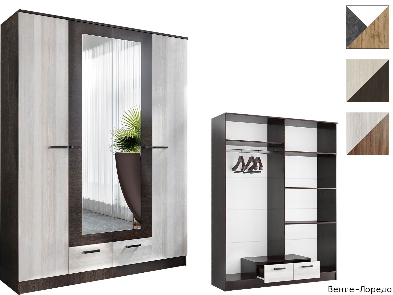 Адель Шкаф 1,6 четырёхстворчатый С Полками, с зеркалами и выдвижными ящиквами - универсальное решение для организации хранения одежды в спальне или прихожей. Модуль оснащён двумя стационарными штангами для хранения одежды на плечиках, двумя выкатными ящиками и двумя полками. Зеркальный фасад визуально облегчает конструкцию шкафа и добавляет воздуха интерьеру, в котором он расположен.
