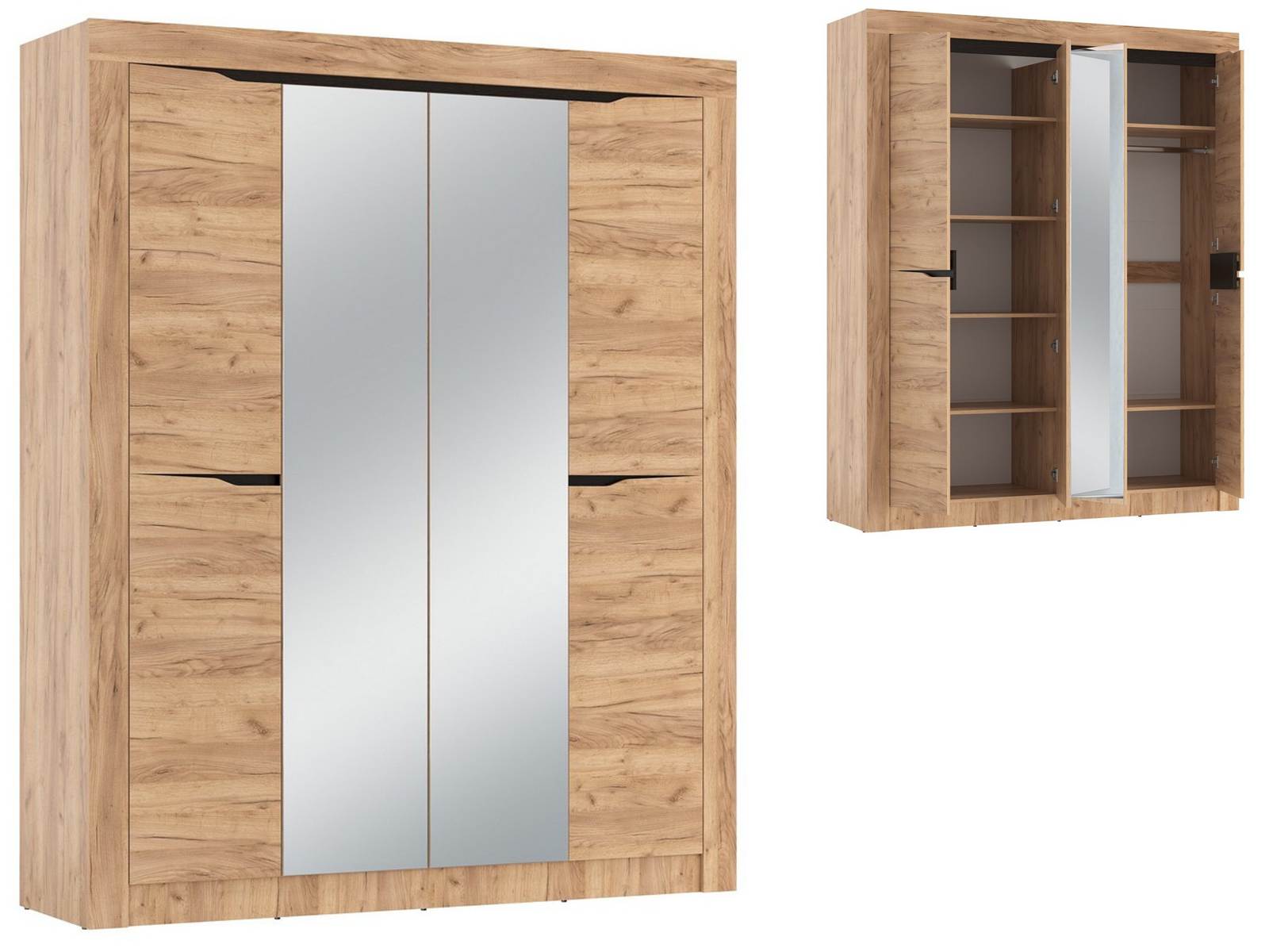 Шкаф оборудован четырьмя распашными дверцами, две центральные двери зеркальные.