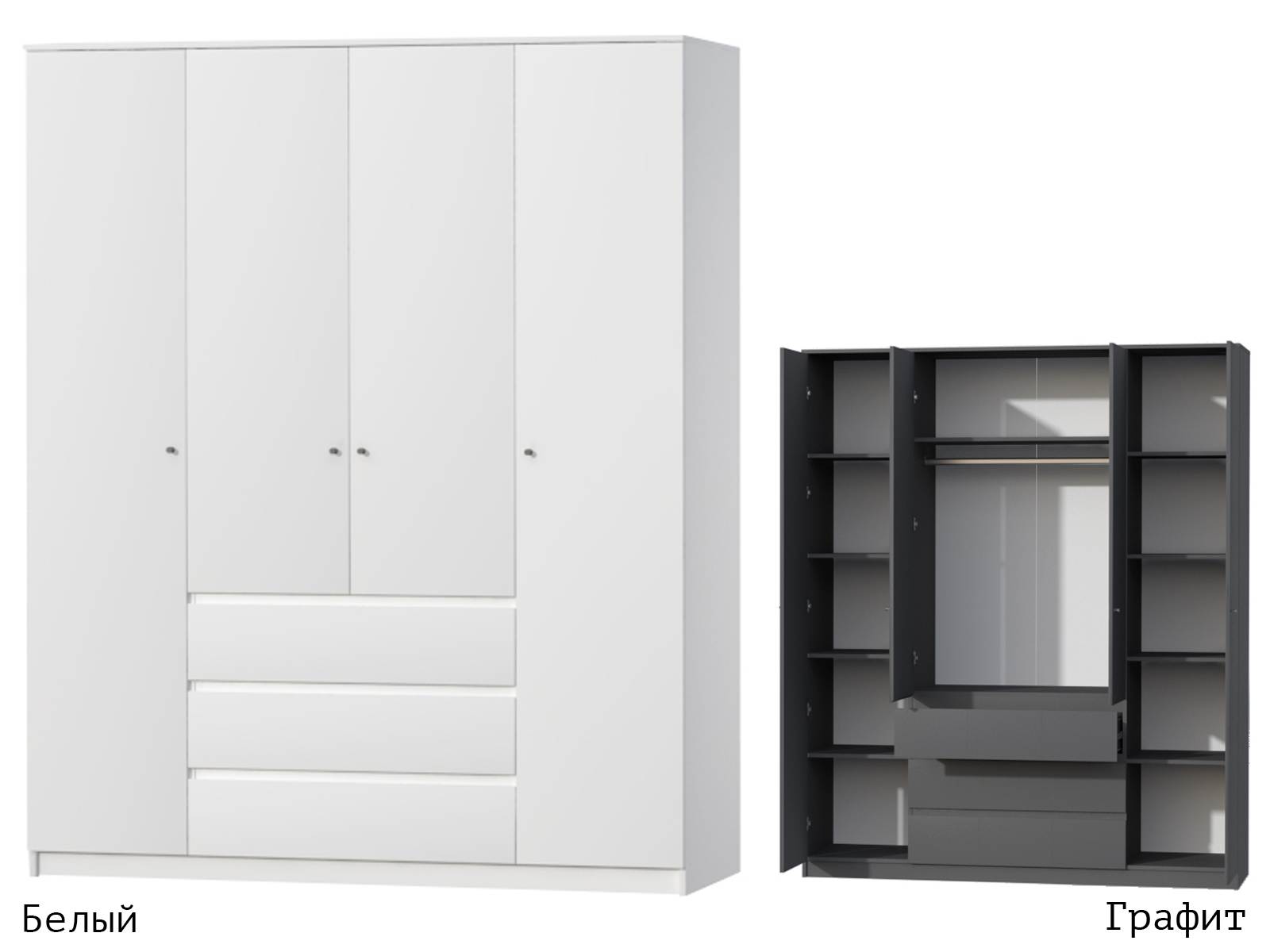 Функциональный, удобный, вместительный четырёхстворчатый шкаф способен прекрасно дополнить и даже украсить собой любой интерьер. В нём легко спрячется от посторонних глаз большое количество вещей (текстиль, постельное бельё, трикотаж), и все они будут храниться в идеальном порядке.