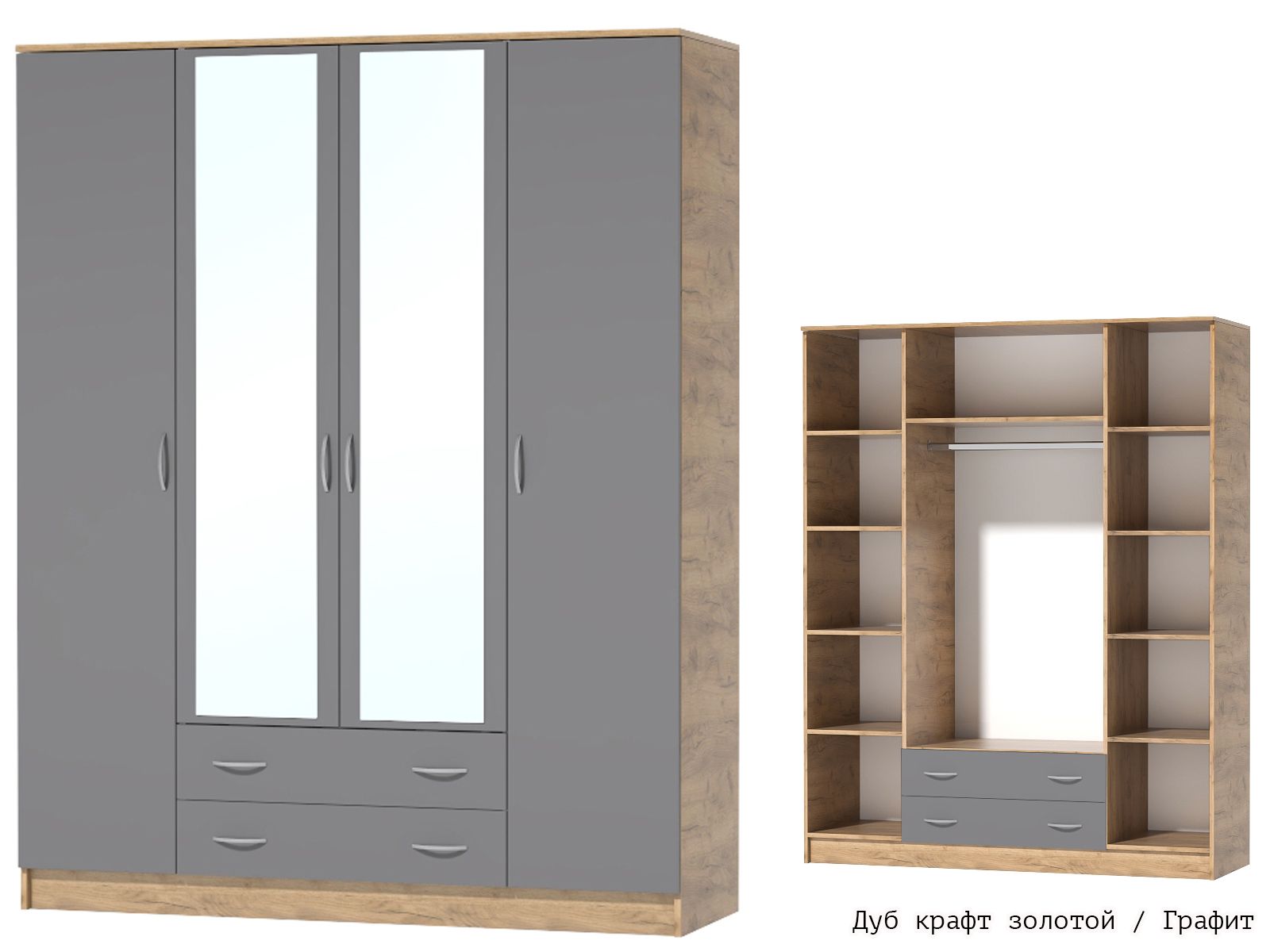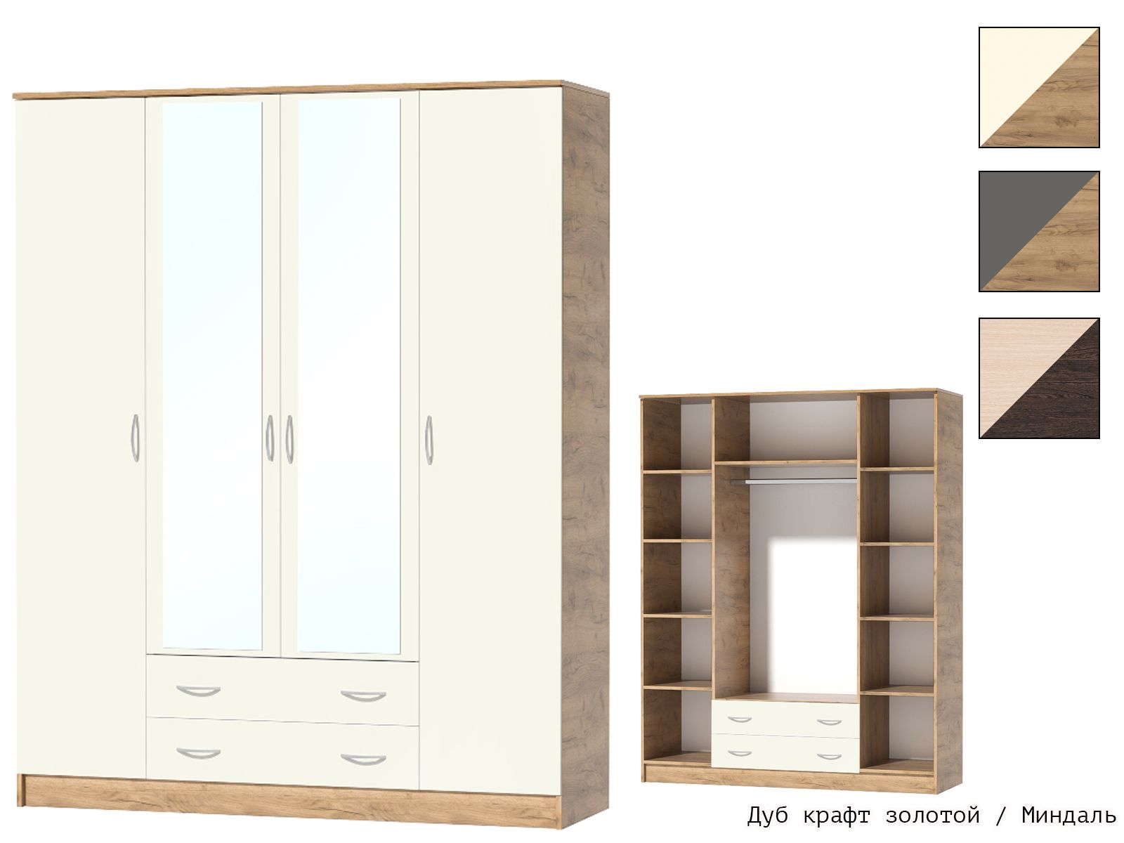 За распашными дверями в левой и правой части находятся отделения с четырьмя полками для белья; в центральной части за зеркальными створками - антресольная полка и металлическая штанга для одежды; внизу - два просторных выдвижных ящика.