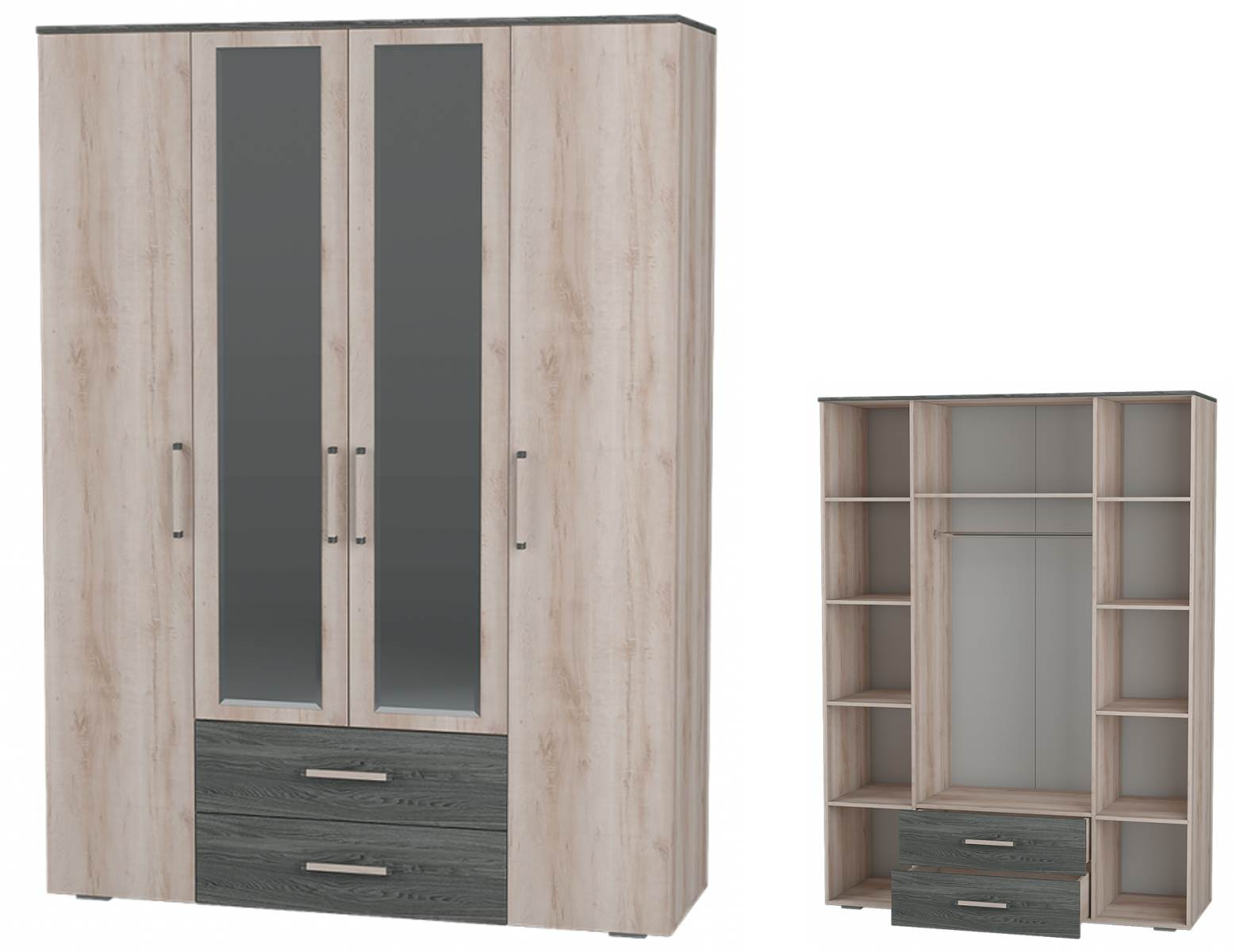 Шкаф четырёхстворчатый Версаль-1 с полками, с зеркалами и выдвижными ящиками - универсальное решение для организации хранения одежды в спальне или прихожей. Модуль оснащён двумя стационарной штангой для хранения одежды на плечиках, двумя выкатными ящиками и полками. Зеркальный фасад визуально облегчает конструкцию шкафа и добавляет воздуха интерьеру, в котором он расположен.