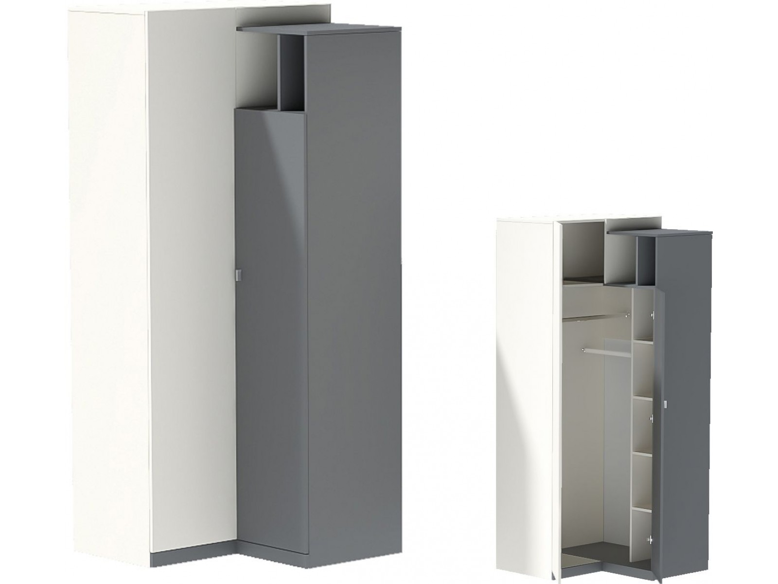 Удобство, комфорт, функциональность и необычный внешний вид - вот отличительные характеристики данного углового шкафа, в котором благодаря наличию двух металлических штанг и полок можно хранить множество разнообразных вещей.