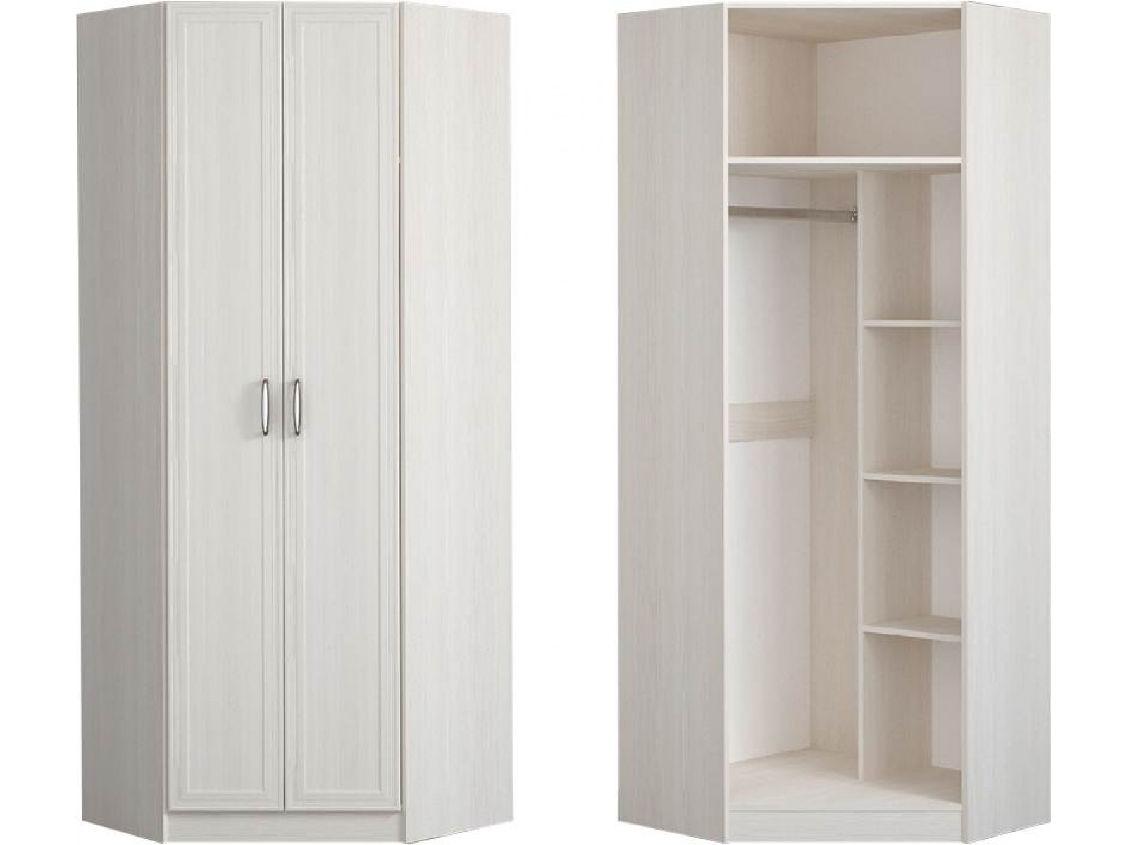 Угловой шкаф позволит наиболее эффективно использовать полезное пространство комнаты, не перегружая интерьер. Он практичный, функциональный и очень вместительный. За распашными дверями находятся: отделение с тремя полками для белья, антресольная полка и металлическая штанга для одежды.