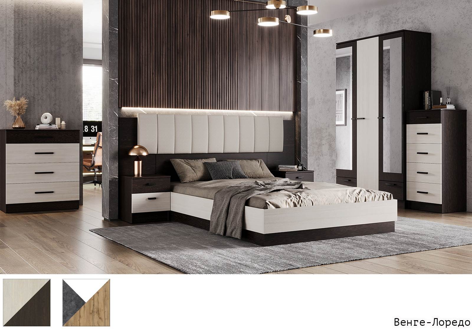Спальня из материалов с приятной фактурой притягивает к себе внимание, трендовые и лаконичные модели новых модулей, геометрически правильной формы излучают настоящее северное спокойствие.