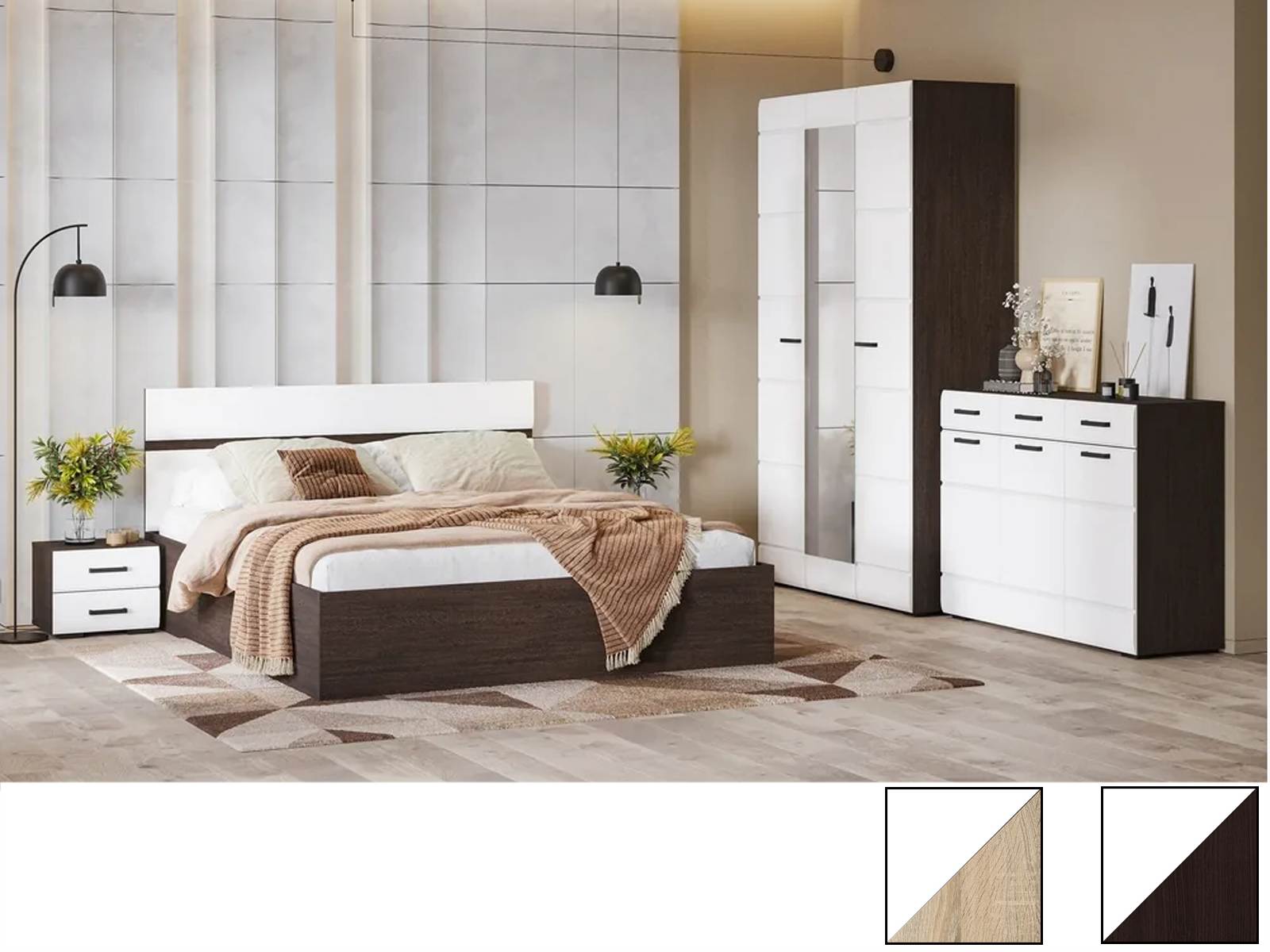 Модули подходят для разных зон квартиры - от прихожей до спальни, и легко сочетаются между собой. Коллекция воплощает современную эстетику: чёткие линии, обтекаемые формы фасадов, натуральные оттенки и удобство в каждой детали.Фасады из МДФ с аккуратной фрезеровкой, подчёркивающей геометрию и добавляющей интерьеру выразительности. Глянцевая поверхность придаёт лёгкость и чистоту, а зеркальные створки шкафов визуально увеличивают пространство и наполняют его светом. Чёрные ручки служат стильным акцентом - они подчёркивают строгость линий и придают коллекции современный характер. Все модули легко комбинируются и подходят для помещений с разной планировкой.