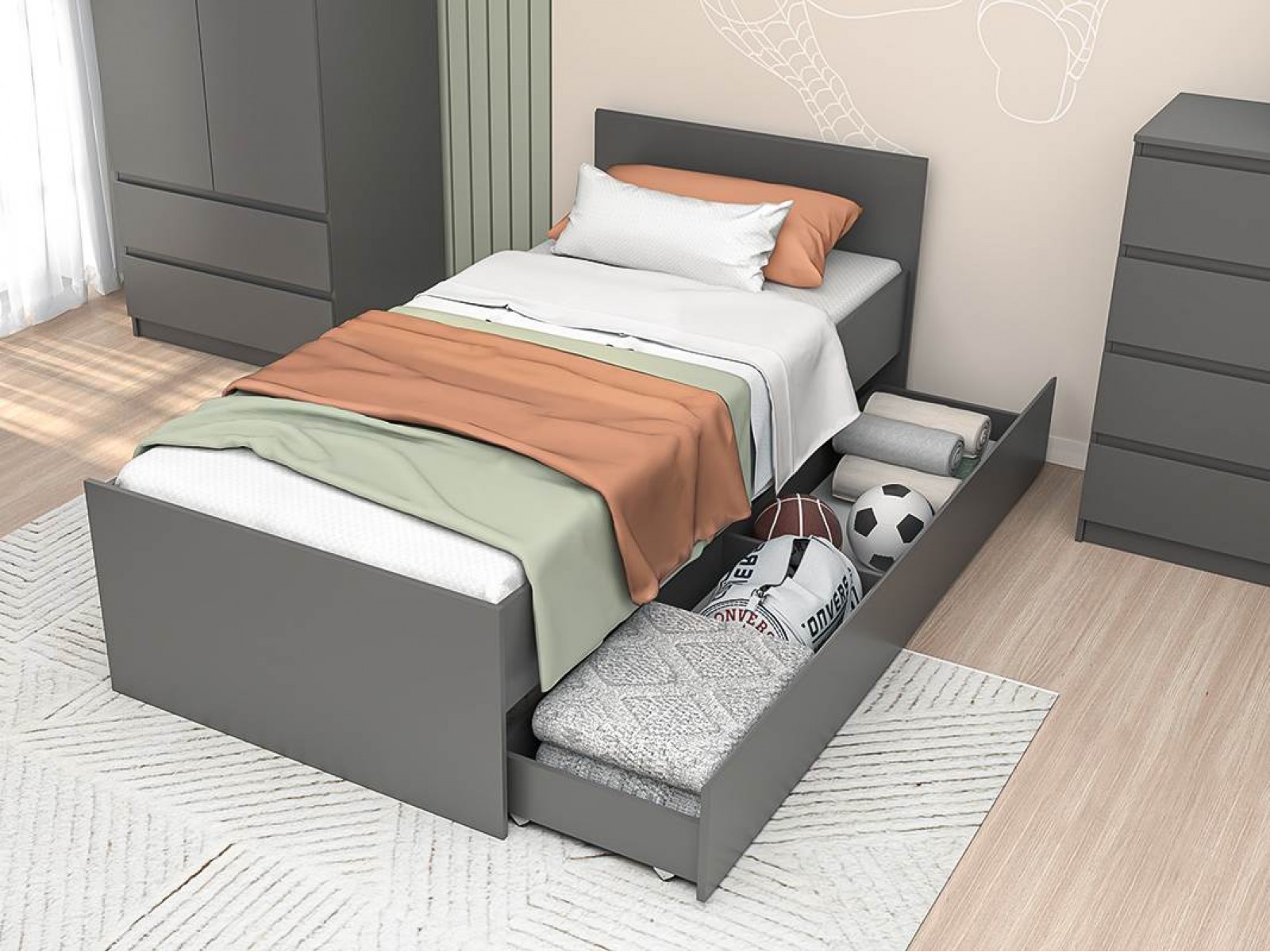 Строгая, лаконичная односпальная кровать с прочным, жёстким основанием идеально подойдёт как для комнаты подростка, так и для спальни взрослого человека. Она не занимает много места, ложиться и вставать с неё удобно с любой стороны.