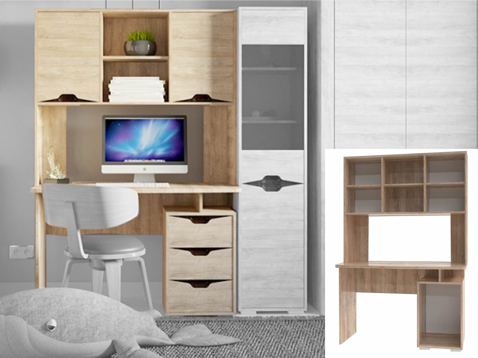 Стол оборудован надстройкой с открытыми и закрытыми полками и тумбой с выдвижными ящиками.