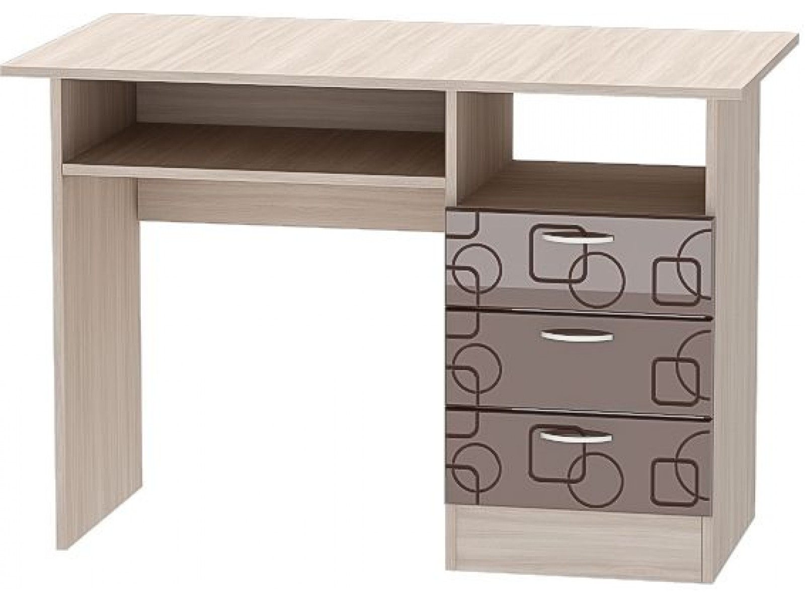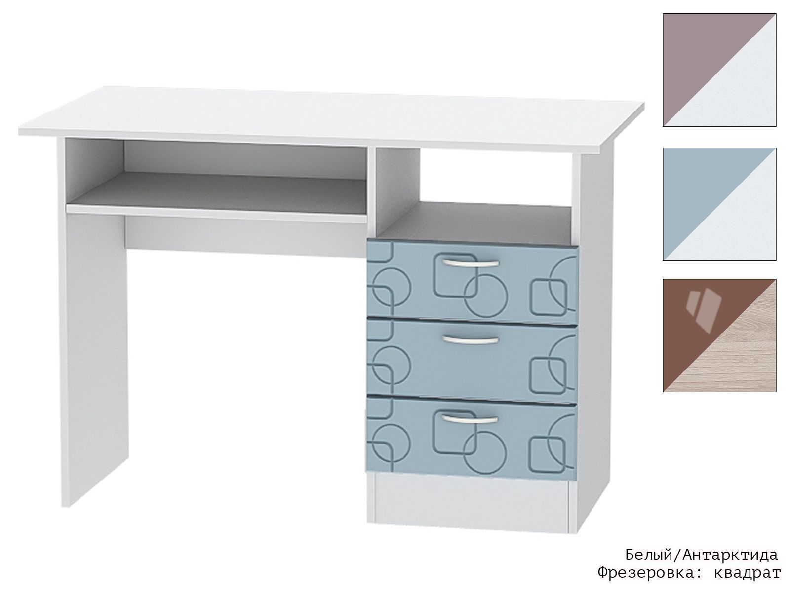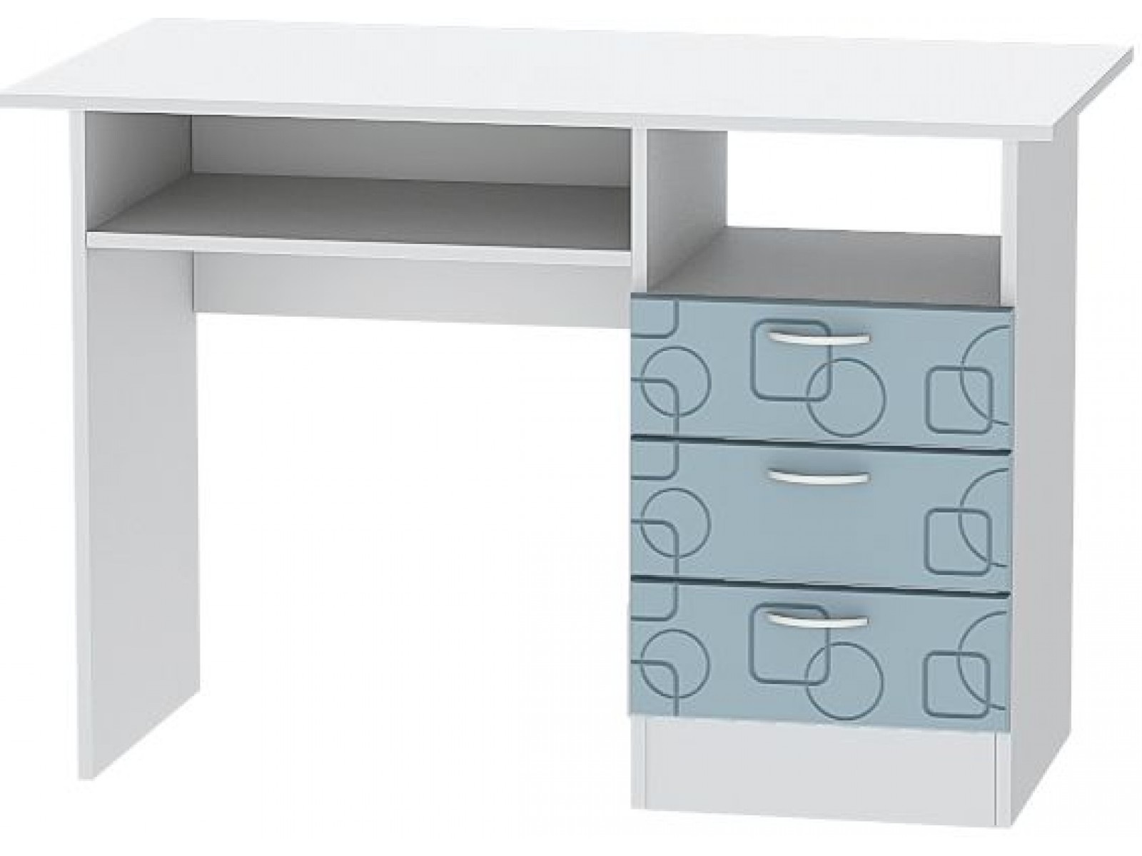 Письменный стол - удобный и простой вариант для детской школьника. При помощи него можно создать комфортное и безопасное рабочее место, за которым ребёнок мог бы делать уроки и выполнять любые другие задания. Рабочая поверхность стола достаточного размера для того, чтобы разместить монитор и прочие принадлежности для учёбы и занятий творчеством, есть открытые ниши и три вместительных ящика для хранения.